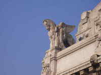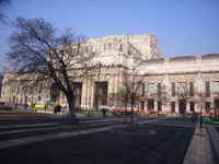 I like Milan very much (btw it has excellent salsa). The first call for designs for a central train station (Milano Stazione Centrale) went out in 1906; the completed building was inaugurated in 1931. For me, it's a successful mix of fascist grandeur and art deco good taste — it's so big, I couldn't get it all in one shot, even at some considerable distance. The interior is also very pleasant. Watch out — the ticket halls are down a very long flight of steps from the actual trains. Try dashing up and down that with a suitcase. Fortunately, the trains were in my experience always late, and I didn't miss even one of them.